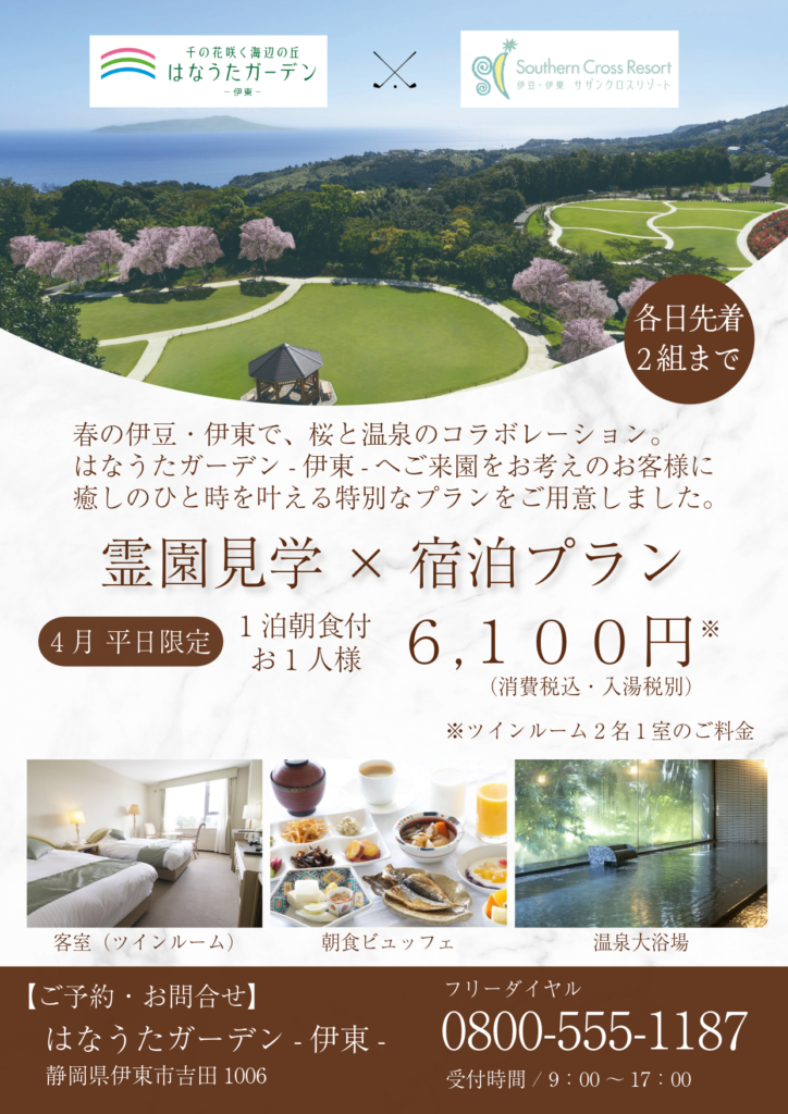 はなうたガーデンは、相模灘や伊豆七島・富士山を望む絶景の地に佇んでおり、ゴルフや温泉・お食事が楽しめる「サザンクロスリゾート」さんの隣に位置しています。